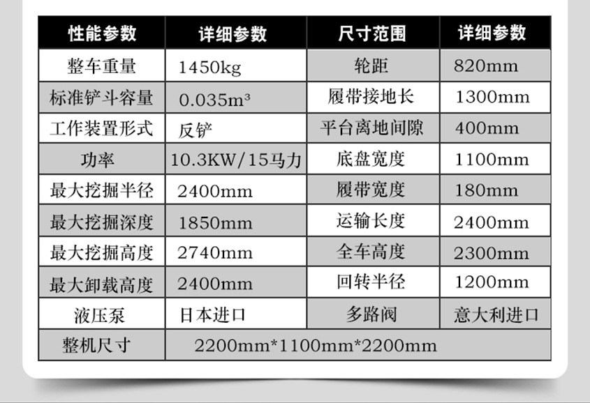 整機重量:1700kg履帶寬度:230mm發動機功率:18.1kw