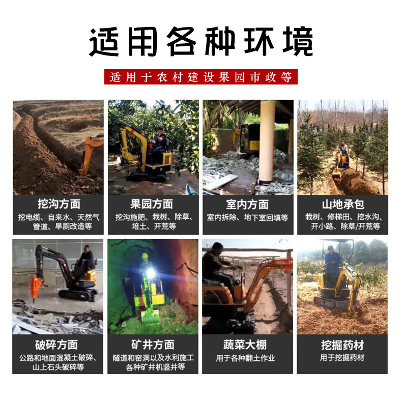 凱迪沃小型挖機具有出色的工作效率及的性價比,操作簡單,小巧靈活,運輸方便,能在狹小場地作業,特別適合在果園如獼猴桃,葡萄園,橘子,臍橙種植,挖溝,施肥,除草等,具備挖掘,破碎,清溝,鉆孔等多功能,可快速更換附件,機器利用率大大提高; 大臂側移裝置:機體前部裝備動臂側移裝置,從而真正實現類似墻根地帶的直接挖掘工作,而無須頻繁移動機身,更加適用于狹小場地作業,可以調式推土機,可選裝破碎器及管路,可實現順暢快捷有力的作業,越的耐久性保養性,世界水準的安全性能。